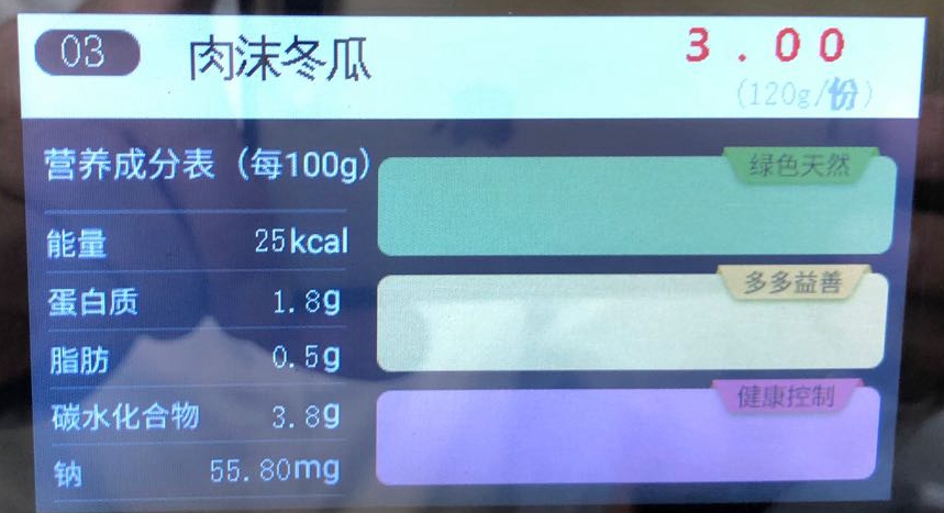 餐厅所有菜品都经由营养剖析并凭证要求标准化制作,,,,,,,录入系统。。。。。。点餐台配有智能显示屏,,,,,,,对目今菜品的营养因素,,,,,,,通过点餐柜台电子屏幕举行展示,,,,,,,营养因素一目了然,,,,,,,食者可凭证小我私家逐日营养摄入情形选择;;;;;;通过刷餐卡和智能餐盘举行绑定,,,,,,,在取餐结算时,,,,,,,智能餐台可以自动识别菜品并扣费。。。。。。