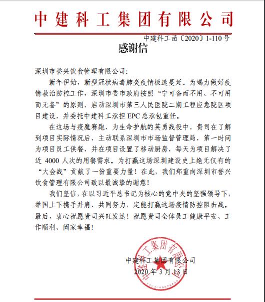 在整个供餐历程中,,,,,,,,今年会官网登录入口集团以优质的服务,,,,,,,,专业的能力和细腻的餐食,,,,,,,,赢得了市食药局、中建科工集团的高度认可和赞誉!也收到了中建科工集团的表扬信!